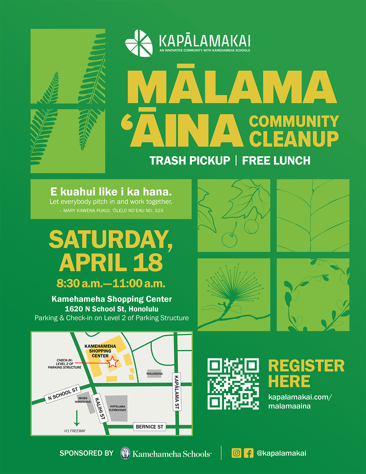 Join us as we care for Kapālama Kai at our annual Mālama ‘Āina Community Cleanup during Earth Month and Native Hawaiian Plant Month. The event provides an opportunity to gather, share kuleana to mālama ʻāina, and make a significant impact. Gather your ʻohana and friends for a morning of service!