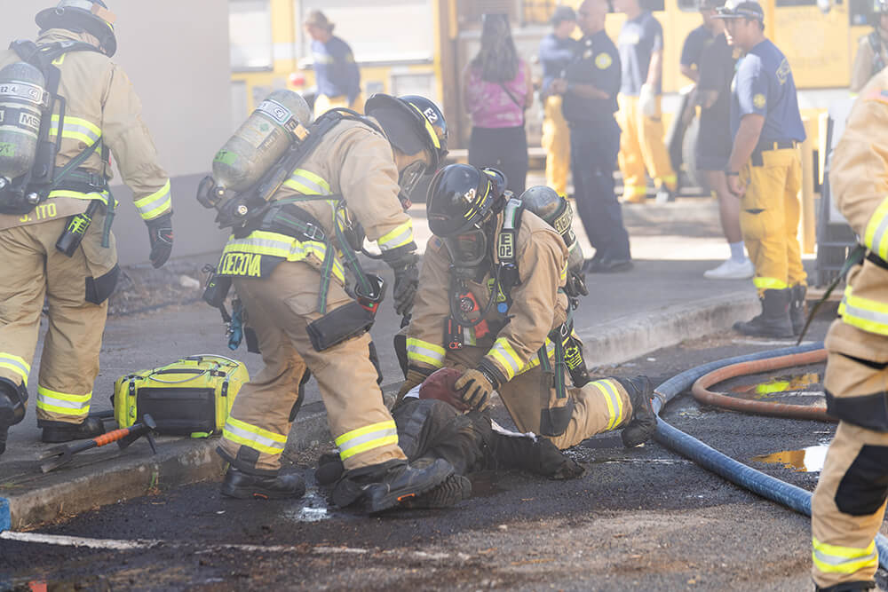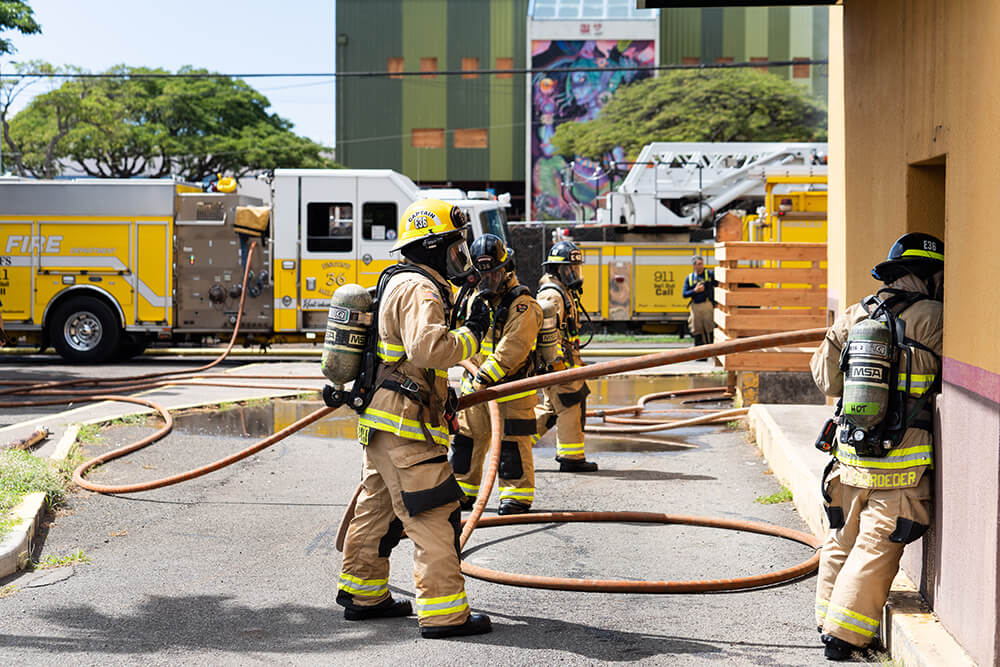 Hoses drawn, Honolulu firefighters battled simulated fires at two buildings at ʻŌlauniu at Kapālama Kai along Dillingham Blvd. The scenarios were designed to mirror real-life emergencies and pushed firefighters to think fast, communicate, move with purpose, and work as one.